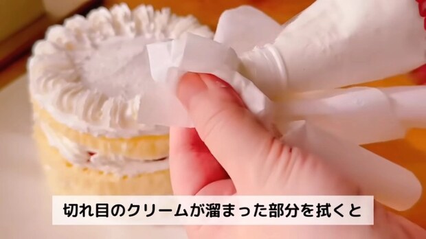 ホイップクリームの先の切れ目にクリームが溜まりやすいので、ティッシュで拭いて取り除けばきれいな形で絞り出せます!