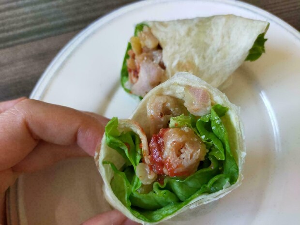 トルティーヤ鉄板の具材、レタス、チーズ、チキン、トマトソースを巻きました。