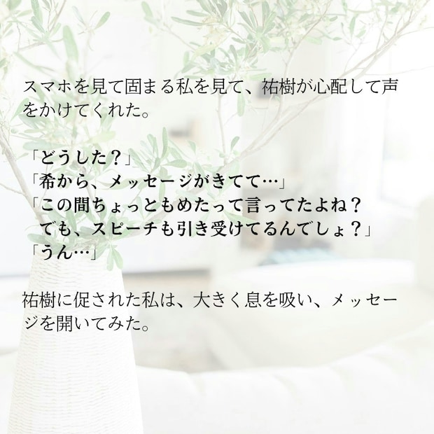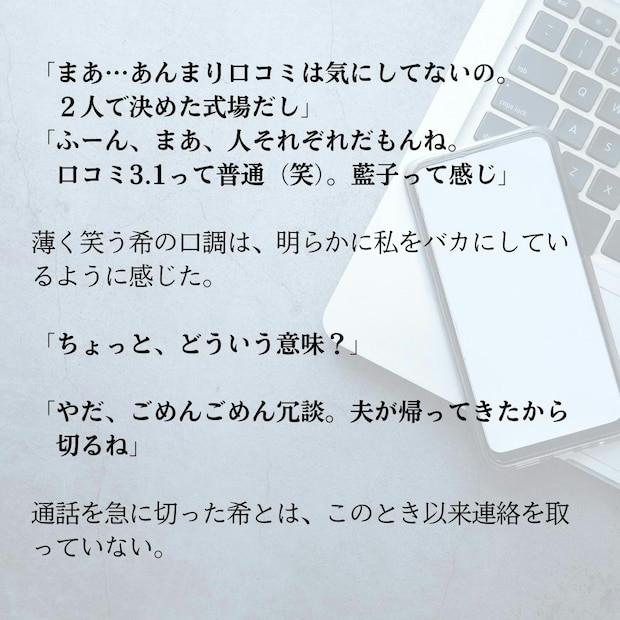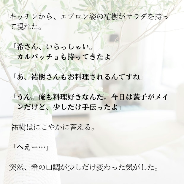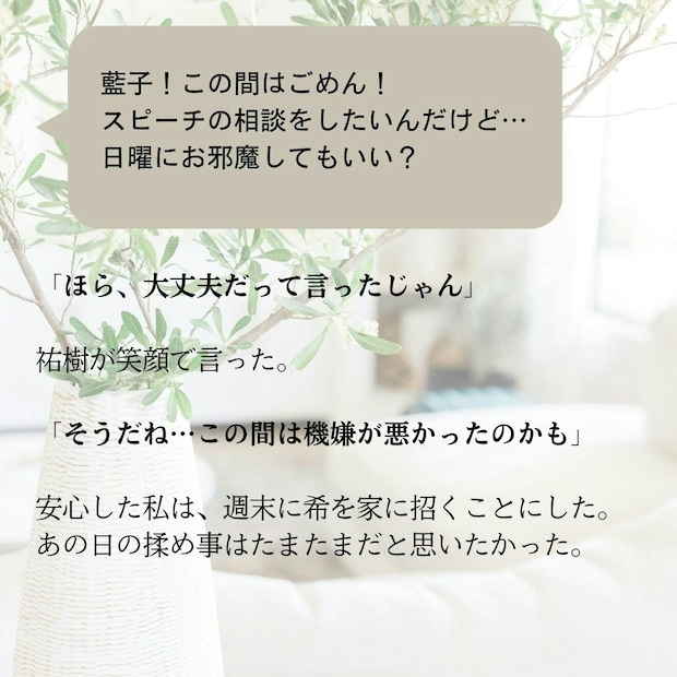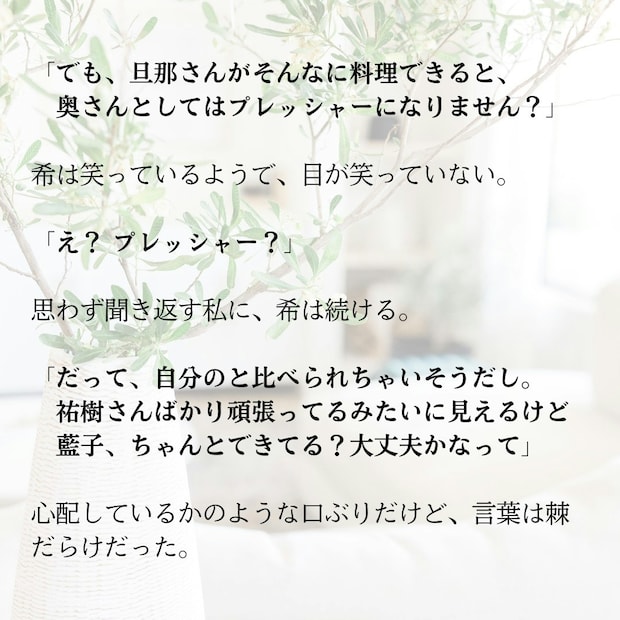 突然、結婚式場にケチをつけた希。暗雲が立ち込めますが、スピーチの依頼をしていたため、家に招きます。すると今度は、夫の料理はほめつつ、藍子をサゲるような発言をします。藍子は徐々に希の発言に違和感を強めていきます。
