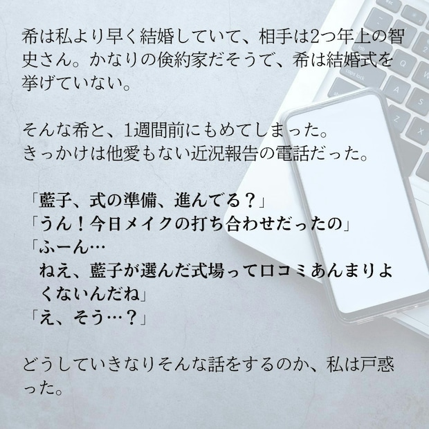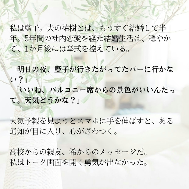 主人公・藍子は、夫の祐樹と籍を入れて半年ほどの新婚です。入籍後にじっくり準備して挙げると決めていた結婚式まであと1か月。幸せな式を想像し準備をしてきました。