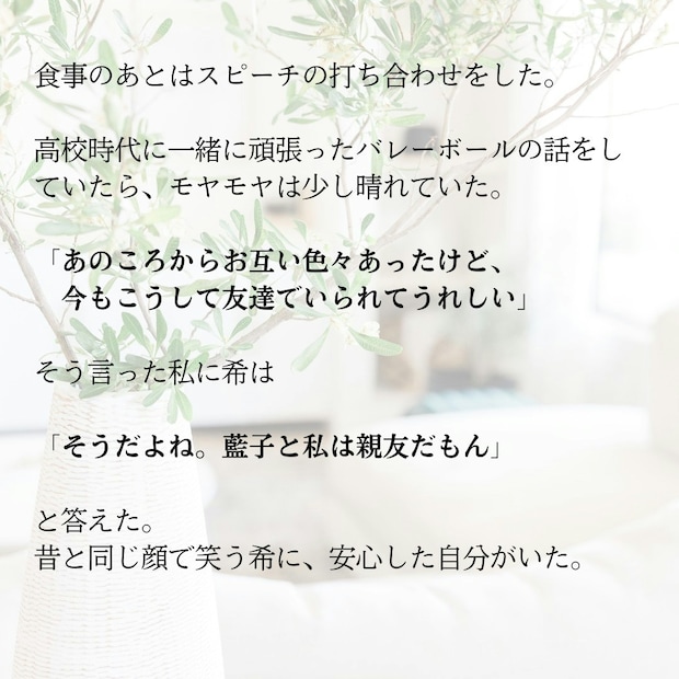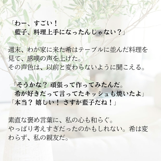 ところがある日、親友・希との会話で、藍子はモヤモヤを抱えることに…。
