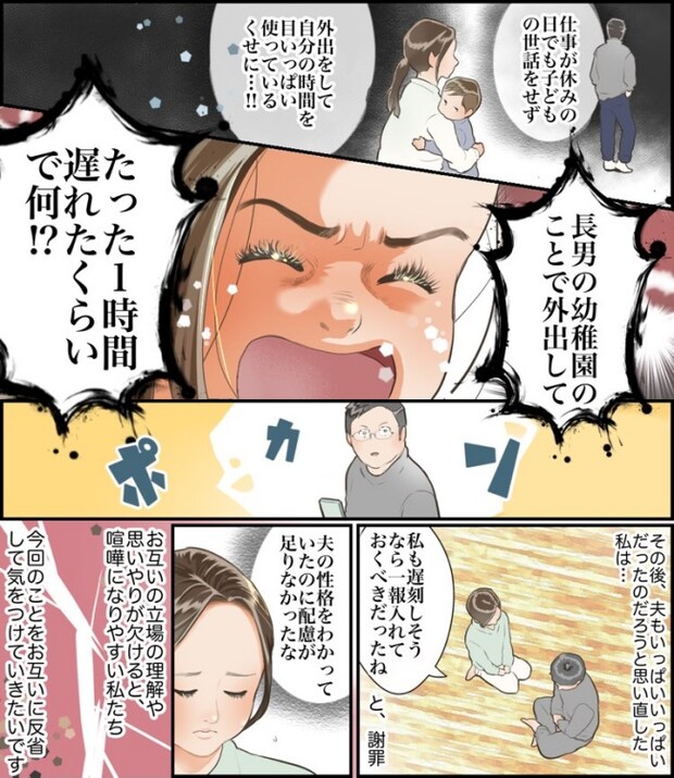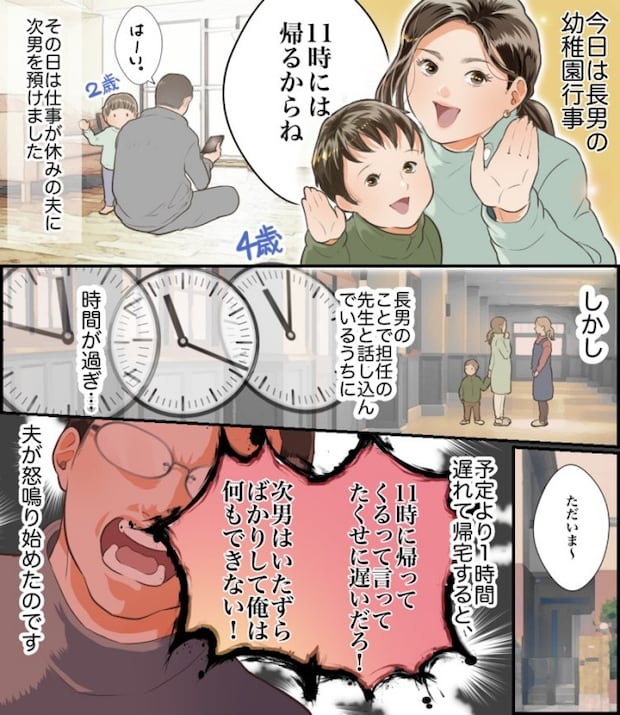私は4歳と2歳の男の子を育てています。ある日、幼稚園の行事があったため、朝から夫に次男を預けて外出していた私。夫には「11時に帰宅する」と伝えて幼稚園へ向かいました。しかし、予定時刻には帰宅できず、そのことで夫は大激怒! その夫の態度に私は、普段の夫への不満がピークを迎え、夫を上回る怒りで対応したのですが……。