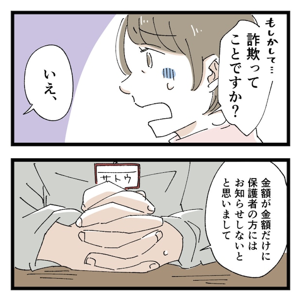 すると、「もしかして・・詐欺ってことですか?」と慌てるお母さんに、「いえ、金額が金額だけに、保護者の方にはお知らせしあいと思いまして」とサトウ先生が言いました。