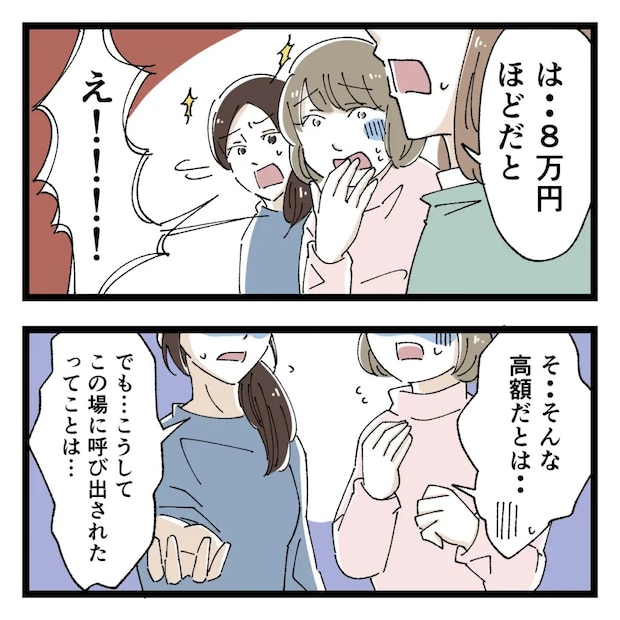 そう聞かれて「は・・8万円ほどだと」と答えると、「え!!!」と驚く二人。「そ・・そんな高額だとは・・」と言葉を失うお母さん、「でも・・こうしてこの場に呼び出されたってことは・・」と呟くお母さん。