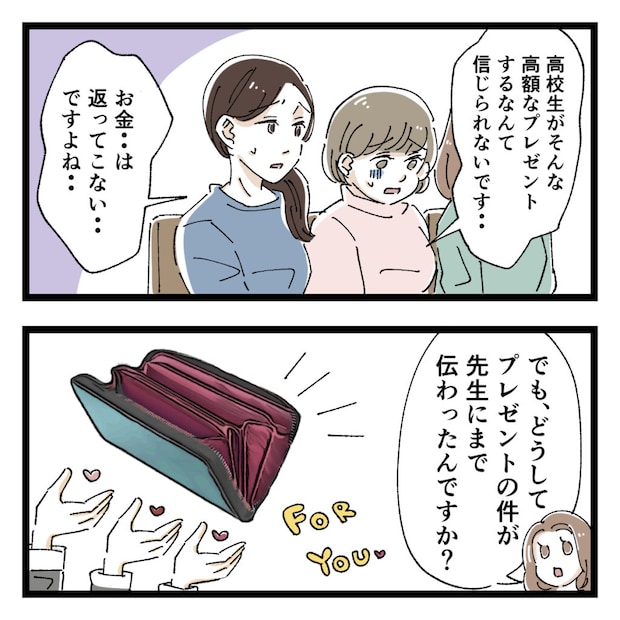 「高校生がそんな高額なプレゼントするなんて信じられないです・・」一人のお母さんがそう言うと、「お金・・は返ってこない・・ですよね・・」ともう一人のお母さんがたずね、私は、「でも、どうしてプレゼントの件が先生にまで伝わったんですか?」と不思議に思いながらたずねました。
