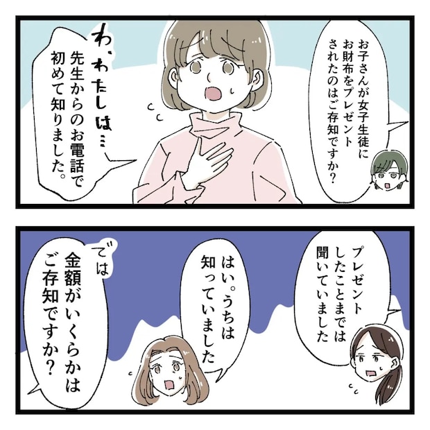参考書や文房具を買う、友達とご飯など頻繁にお母さんにお金を要求するようになった高校生のショウ君。あまりの頻度にお母さんが不審に思っていると、明らかに4人で食べたであろう食事のレシートを出し3人で行ったとお金を多くもらおうとするショウ君。問い詰めると好きな子にハイブランドの8万円の財布をプレゼントしたいと言い出してお母さんはビックリ。相手は同級生の女の子で彼女ではなくショウ君の片思い。本人に買ってと言われたわけではないものの、こんなに高い財布を要求するのかとモヤモヤしていると、「母さんの推し活と一緒」と言われて言葉を失いました。その後、お父さんに相談すると、「渡してやれば?あと3万でしょ?」サラリと言い、お父さんがお金を渡すとショウ君は大喜びしました。それから一週間後、学校からうなだれて帰って来たショウ君を見てお母さんが「ご飯は?」と声をかけるも「いらない」とさっさと部屋へ行ってしまったショウ君に声をかけるも無言。そんな時学校から電話があり、財布をプレゼントしたことでお話したいことがあると言われたお母さん。翌日学校へ行くと、先に来ていたお母さん2人が椅子に座っていました。