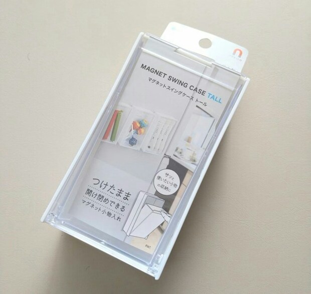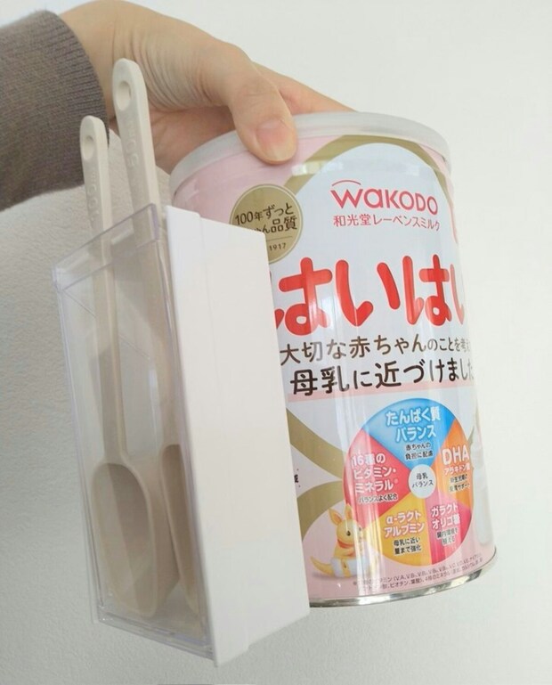 「マグネットスイングケース トール」という商品名で販売されているケースが、粉ミルク用のスプーンの保管にシンデレラフィットしたそう。スプーンが2本入るサイズで、粉ミルクの缶にマグネットでつけられるというのはすごいですよね。これならスプーンをサッと取り出せます。