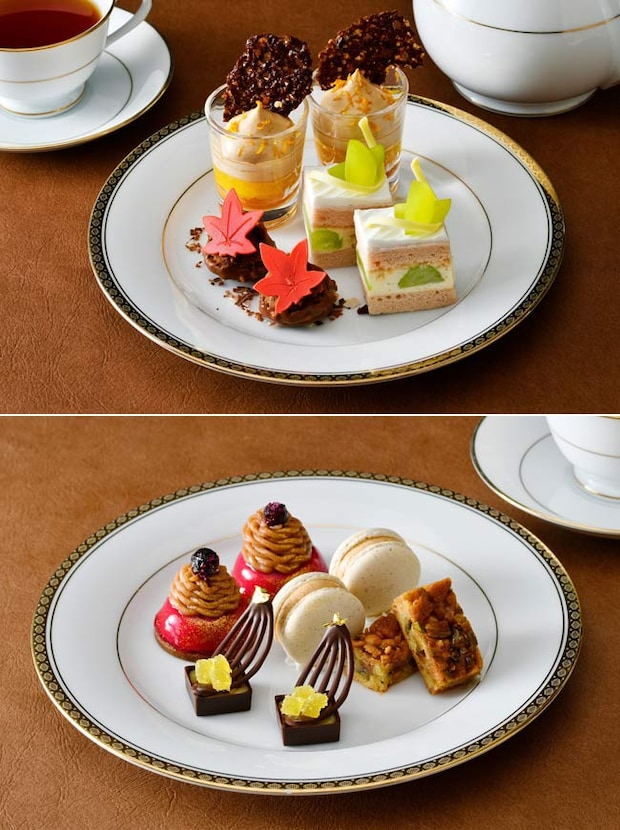 金木犀を思わせる「マンダリンオレンジのサバラン」や、深紅のカシスムースに濃厚なモンブランクリームを絞って仕上げられた「カシスショコラモンブラン」、旬のフルーツを使用した「マスカットとプラリネのショートケーキ」に「洋梨とミルクティーの生チョコ」、「秋のラムボール」など、こだわりのスイーツがティースタンドを彩る。