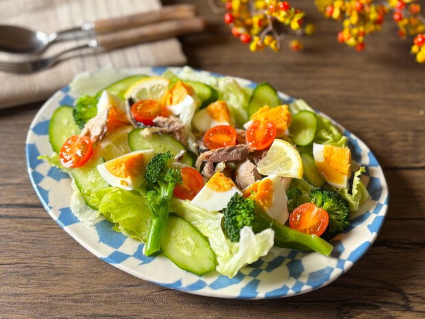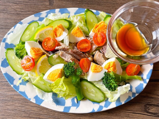 野菜を皿に盛りほぐした焼き鯖鯖をのせ、オリーブオイルとポン酢しょうゆで味付けして完成です。