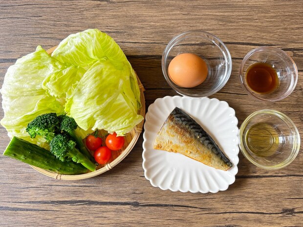 焼き鯖は、サラダのトッピングに使ってもおいしいです。さばの脂や旨みで、ドレッシング不要。レシピではポン酢しょうゆをまわしかけますが、レモンをギュッと絞ってもよく合います。野菜がもりもり食べられますよ。材料(2人分)