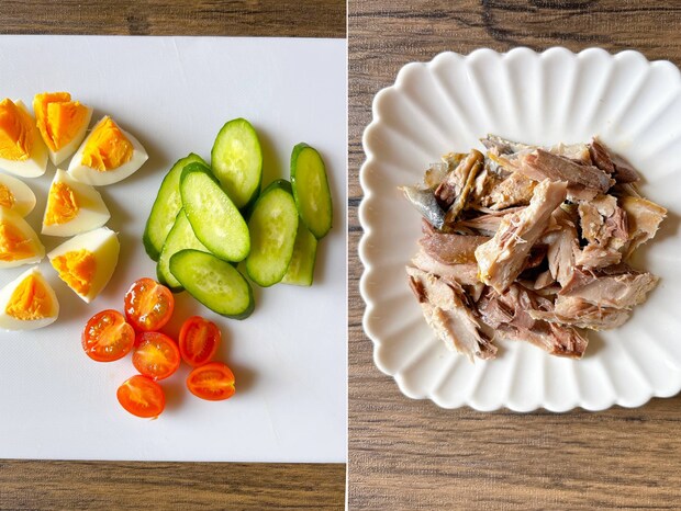 野菜とゆで卵をカットし、焼き鯖をほぐす
