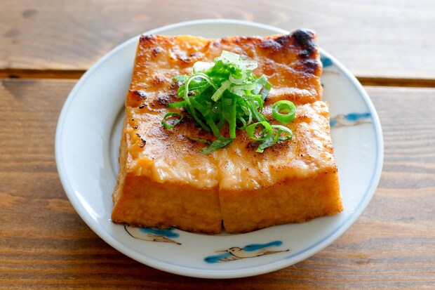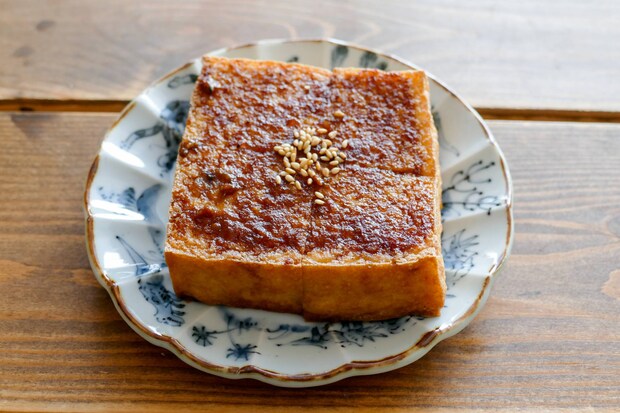 しょうゆとみりんで味付けするシンプルな厚揚げです。厚揚げにみりん小さじ1杯をまぶしてトースターで8分ほど焼き、しょうゆ小さじ1~2杯をかけてさらに2~3分焼きます。