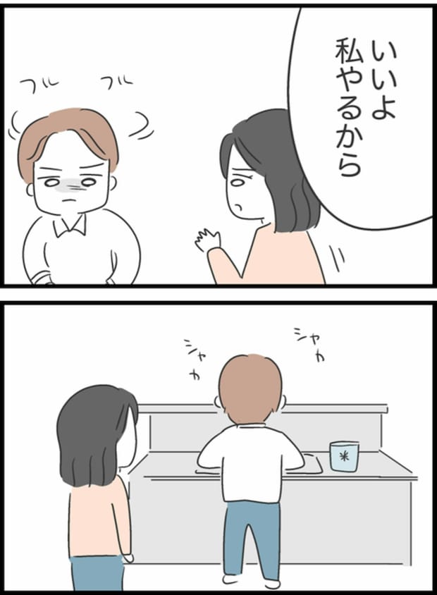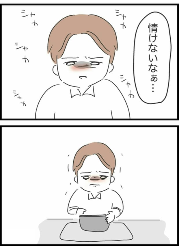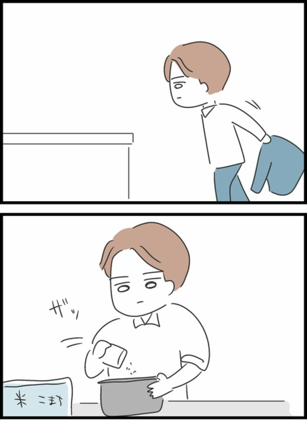 無言で米を研ぎ、なみだを浮かべはじめたしょうた。「いいよ私やるから」というようこを無視しながら、涙を目に浮かべ…。