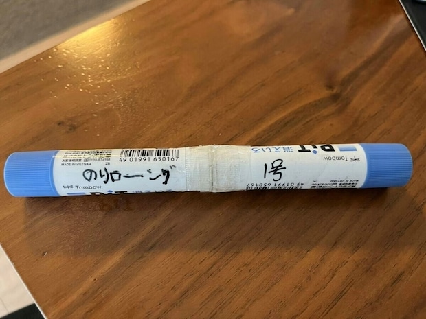 スティックのりが2本つなげられ「のりローング1号」とネーミングされたのり。なぜつなげたのか、なぜ名前をつけたのか、気になることはいろいろありそうです。