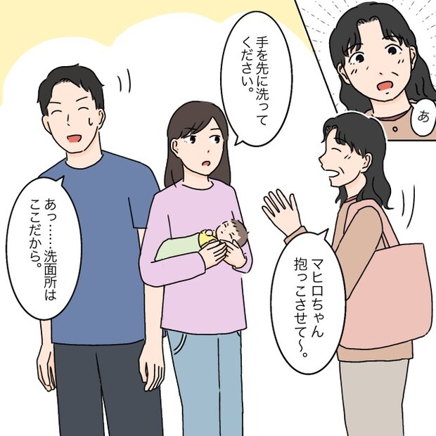 無反応でいると、義母がマヒロを見てぱあっと嬉しそうな顔になりました。「マヒロちゃん抱っこさせて~。」と近寄ってきた義母に「手を先に洗ってください。」とピシャリ。慌ててタケルが義母を洗面所に案内しました。