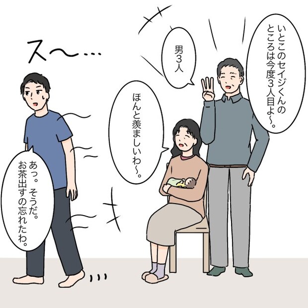 すると義両親が「いとこのセイジくんのところは今度3人目よ~。」「男3人」「ほんと羨ましいわ~。」と口々に言うので、タケルは「あっ。そうだ。お茶出すの忘れたわ。」と話を逸らしました。