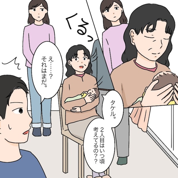 マヒロを抱っこした義母に、さっそく「2人目はいつ頃考えてるの?」と聞かれたタケルは「え?それはまだ」と落ち着かない様子です。