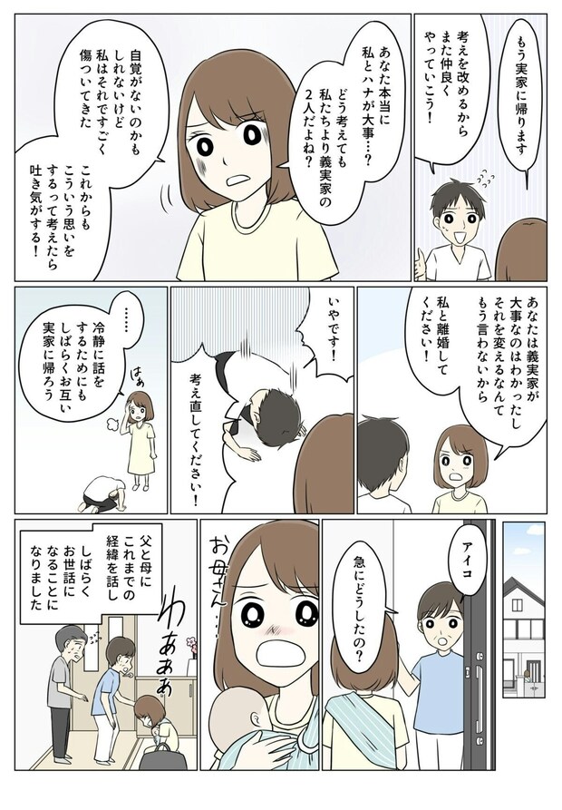 離婚してほしいと話すアイコにヨシは土下座をして離婚はしたくないと話します。しかし、アイコにはもうヨシの声は届いていませんでした。実家に帰り、両親に事情を説明すると父は両家での話し合いを提案してくれました。