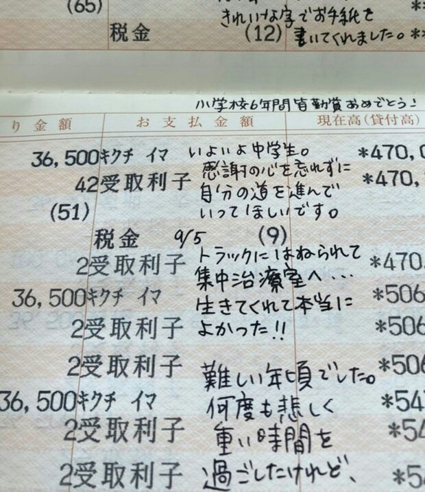 なお、通帳は印字する前の面には何も書かず、すでに印字された行の空きスペースにメッセージを添えていたそうです。