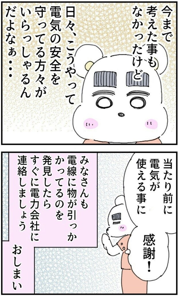 電気の安全を日々守ってくれていると考えると、とてもありがたい存在ですよね。また、電線に引っかかっているビニール袋を無視せずに通報したくまおのマンガ堂@くまおさんも素晴らしい行いをしましたね。