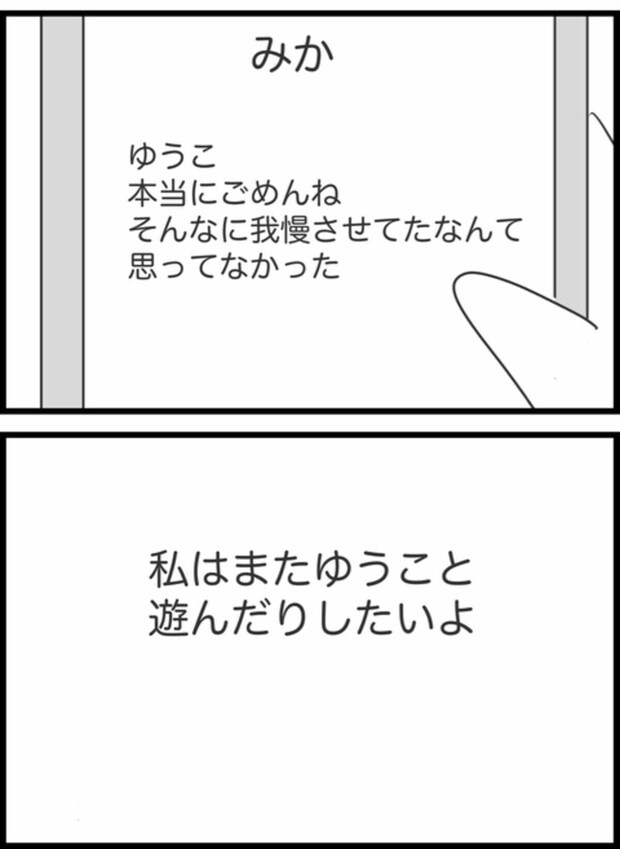 みかから届いたメッセージには謝罪の言葉とまたゆうこと遊びたいという気持ちが書かれていました。ゆうこはこのメッセージにどう返事をするのでしょうか。