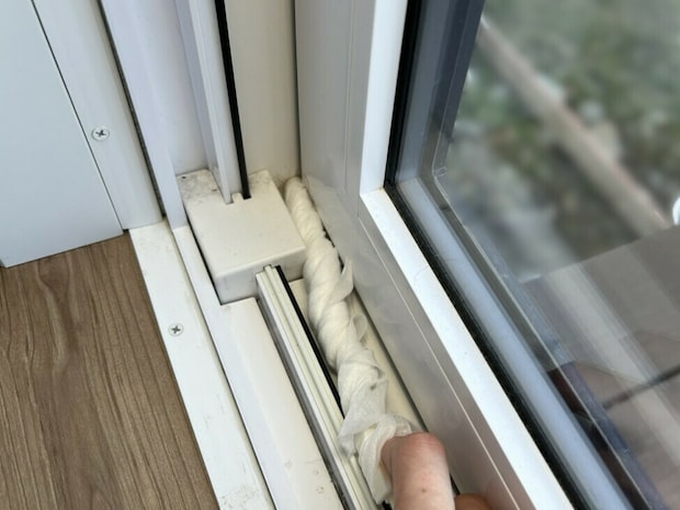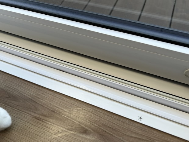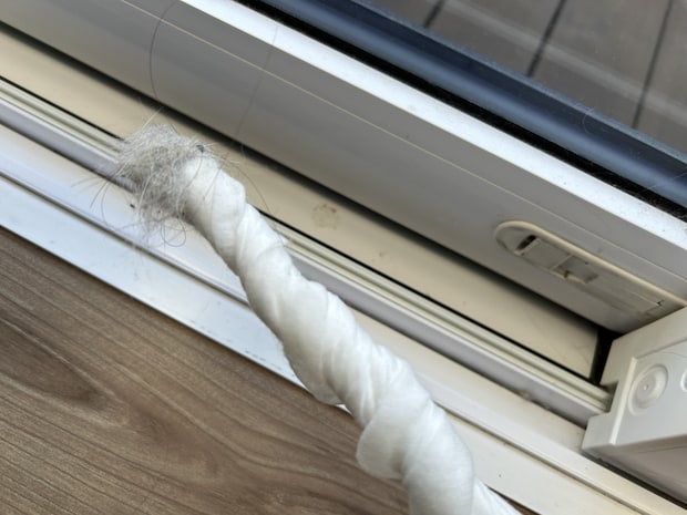 サッシの狭い溝に入れてみました。狭い溝にもしっかりはまって、隅の汚れもかき出せます。