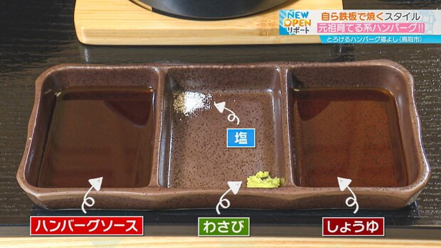 ハンバーグソース、塩、わさび、醤油の4種類が用意されているので、お好みでいただきます。