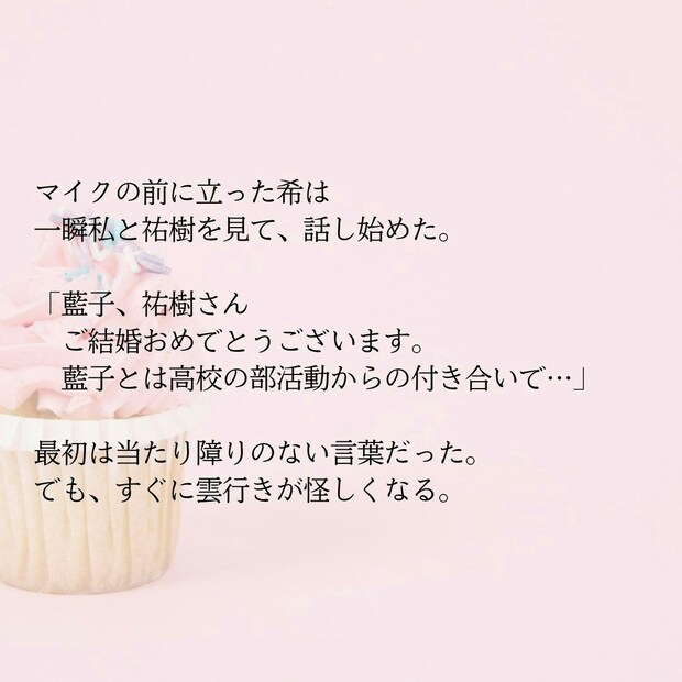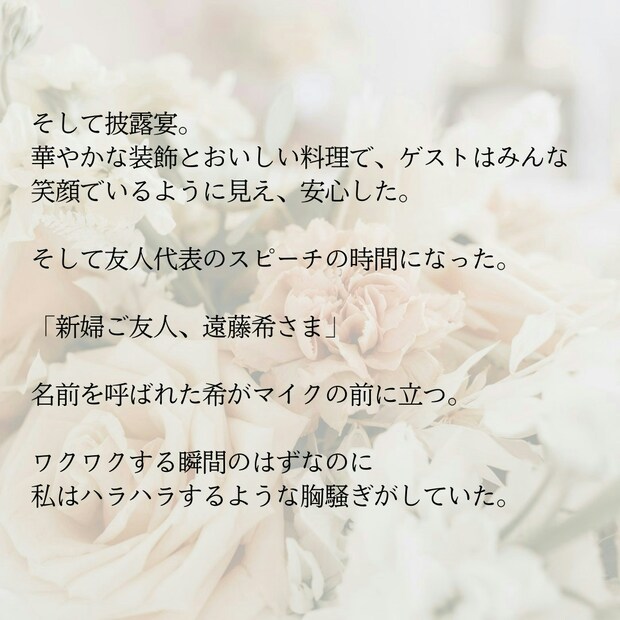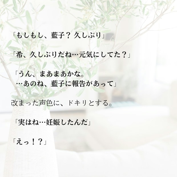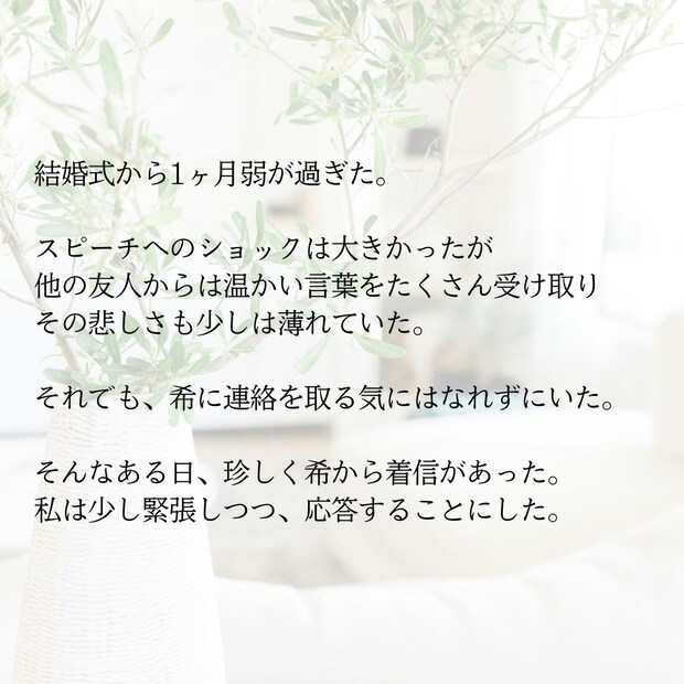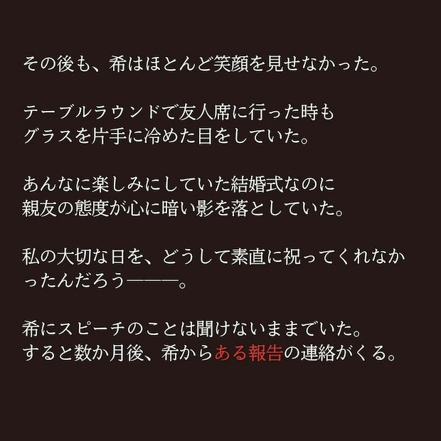 主人公・藍子は、親友・希から「結婚式場の口コミ、よくないね」と言われモヤモヤします。しかし、友人代表スピーチをお願いしているため、ギクシャクしたくありません。気を取り直して、希を自宅に招き、スピーチの打ち合わせをします。