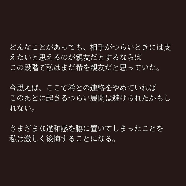 藍子にとって、モヤモヤは募るばかりですが、仲良しだった親友を簡単に切り捨てることはできません。大人になってからの友人関係について、考えさせられる作品です。