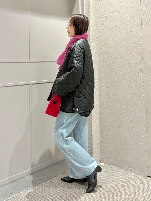 「キルティングジャケットを主役に大人カジュアルにスタイリングしました。コーデのアクセントになるよう、マフラーやバッグでピンクを取り入れたのもポイントです」