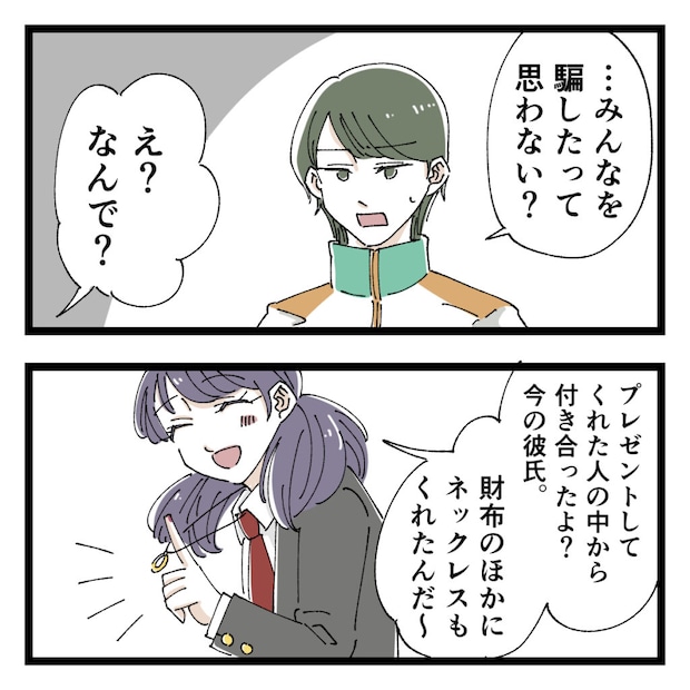 「・・みんなを騙したって思わない?」呆れたようにたずねる先生に、「え?なんで?」と不思議そうに言う女子生徒は、「プレゼントしてくれた人の中から付き合ったよ?今の彼氏。財布の他にネックレスもくれたんだ~」と貰ったネックレスを指に引っかけて嬉しそうに言ったのでした。