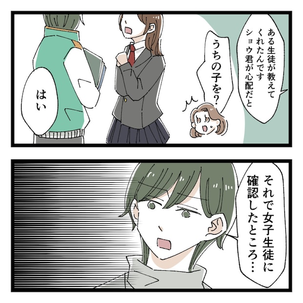 すると、「ある生徒が教えてくれたんです。ショウ君が心配だと」先生の言葉に「うちの子を?」と驚いて聞き返すと、「はい。それで女子生徒に確認したところ・・」と先生が切り出しました。