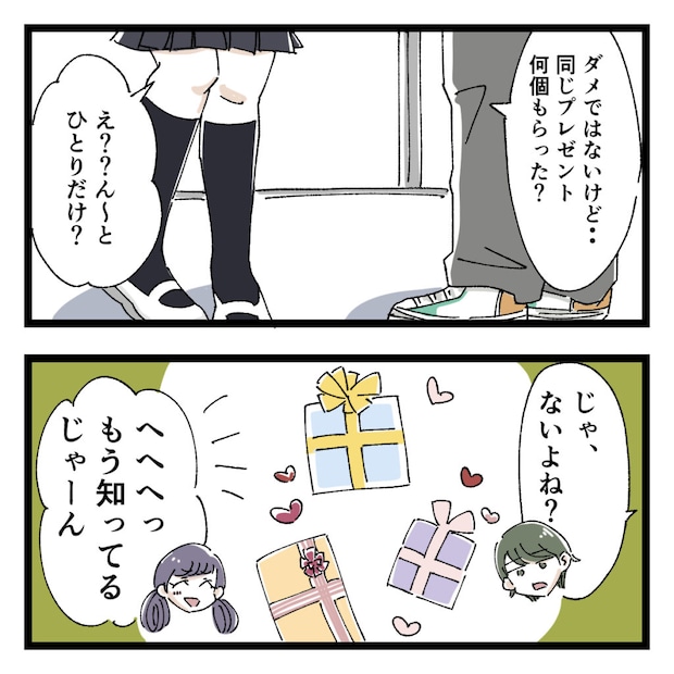 「ダメではないけど・・同じプレゼント何個もらった?」先生の言葉に、「え??ん~とひとりだけ?」としらばっくれる女子生徒は、「じゃ、ないよね?」先生にそう言われて「へへへっもう知ってるじゃーん」と開き直って言いました。