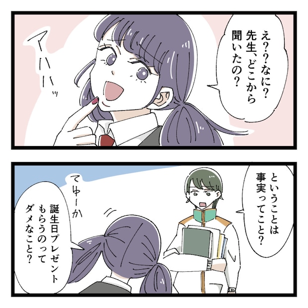 財布をプレゼントされた女子生徒に聞くと、「アハハッえ??なに?先生、どこから聞いたの?」と笑いながら聞き返すだけ。「と言うことは事実ってこと?」先生が冷静にたずねると、「てゆーか、誕生日プレゼントもらうのってダメなこと?」とまたしても逆質問。