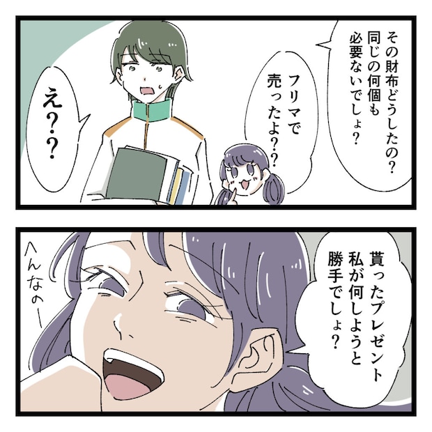 「その財布どうしたの?同じの何個も必要ないでしょ?」先生がそう言うと、「フリマで売ったよ??」と平然と答え、「え??」驚いて聞き返すと、「貰ったプレゼント私が何しようと勝手でしょ?へんなのー」笑いながらそう言いました。