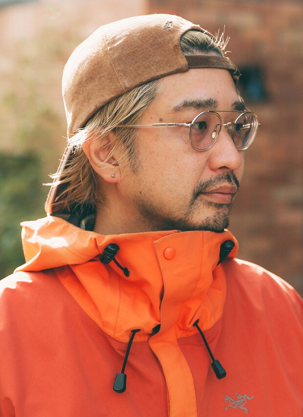 古着屋でキャッチしたブラウンのキャップがこなれ感抜群! シルバーフレームのメガネで緊張感をプラスしたのがグッド。