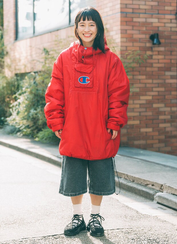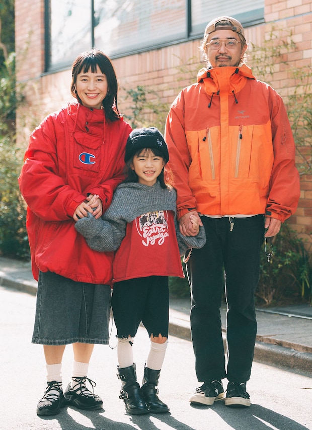 アウトドアMIXスタイルに都会的なエッセンスを加えて、洗練さを出したファミリーコーデがおしゃれ! みんなでレッドやオレンジと暖色をたっぷりつかって元気いっぱいに、上品な小物で引き締めたのがサマ見えのコツ。