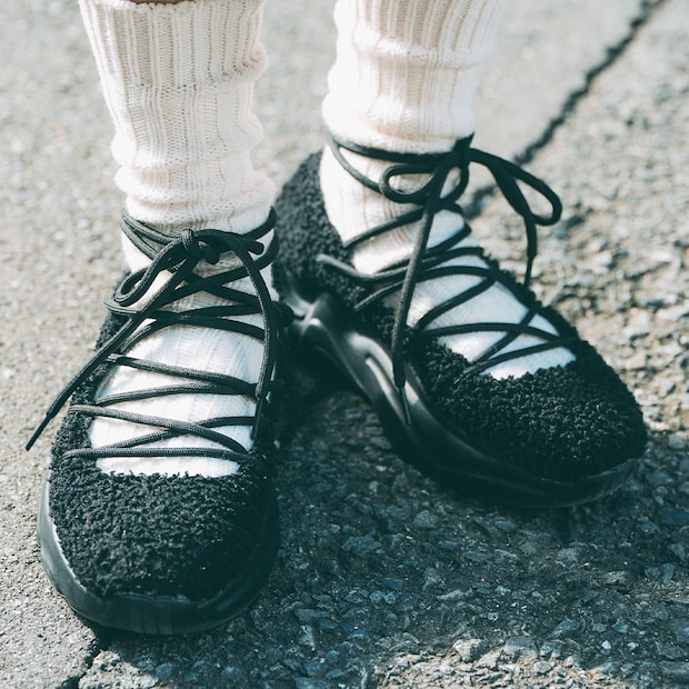 ボア素材にスポーティなソールとハイブリットなシューズが新鮮! レースアップしたデザインがバレエコアを感じる一足。