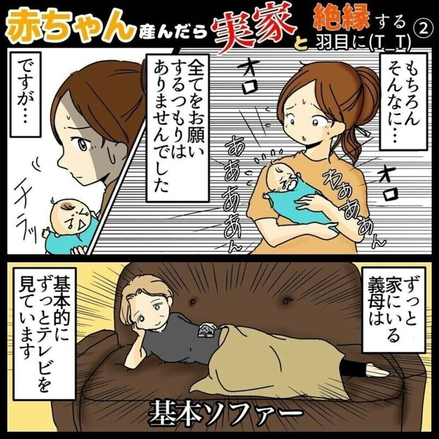 慣れない義実家で初めての育児をしている中、「全部やってあげるから」と言っていた義母はずっとテレビドラマを見ています。イライラしがちな出産後の体調で義母からの十分なサポートも得られず、子どものお世話で寝不足の日々。