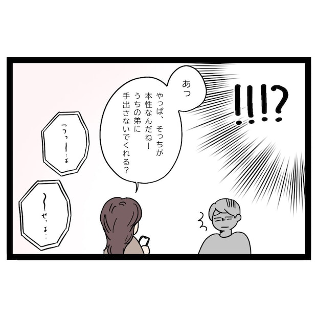「!!!?」突然のレイ子の豹変ぶりに驚いたまさひで。レイ子の言葉を聞いて「あっ、やっぱ、そっちが本性なんだねー。うちの弟に手出さないでくれる?」私が淡々とそう言うと、「うっ・・・よ」「・・せーよ・・」と何を言ってるのかわからない声が聞こえたかと思うと、