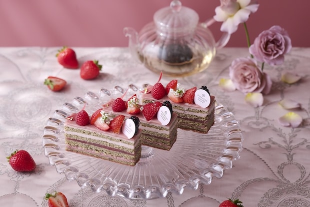 「オペラ・ロゼ・アールグレイ」は、イチゴと紅茶で華やかに仕上げた仏菓子「オペラ」。イチゴのガナッシュやバタークリーム、ローズゼリーなどをそれぞれ紅茶のジョコンド生地でサンドし、層にして重ねた。ほどよく馴染んだ甘酸っぱさと紅茶の香りが引き立つ、上品な一品。