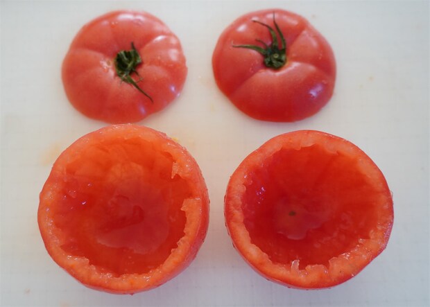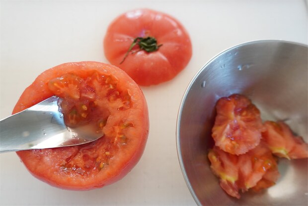 1. トマトは上部を切り取り、中身をスプーンでくり抜いてトマトの器を作る。