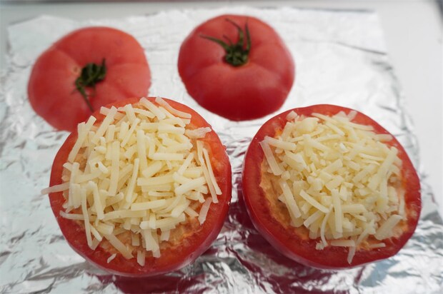 4. 3にピザ用チーズを乗せてトースターで約10分焼く。トマトのフタも一緒に焼く。