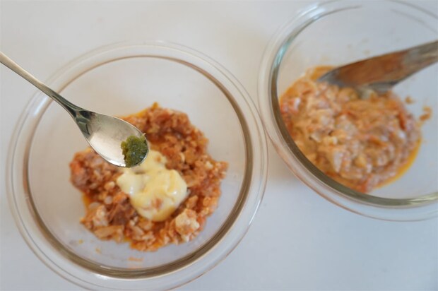 今回、2を半量に分けてそれぞれにマヨネーズ大さじ1を加えて混ぜ、大人はゆずごしょうあり、子どもにはゆずごしょうなしを準備しました。