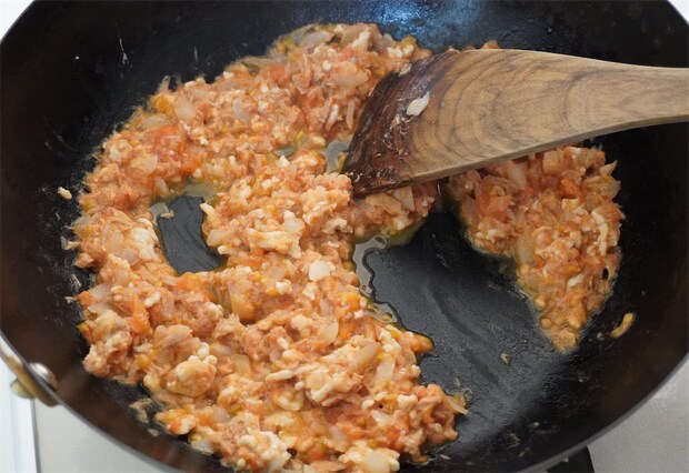 2. 玉ねぎはみじん切りにしてツナ缶は汁気を切る。フライパンにサラダ油を熱して玉ねぎ、鶏ひき肉、ツナを炒め、鶏ひき肉の色が変わったら1でくり抜いたトマトを加えて炒める。