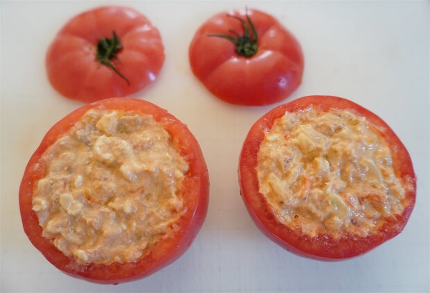 3. 2をボウルに移して粗熱を取り、マヨネーズとゆずごしょうを加えて混ぜたらトマトの器に詰める。