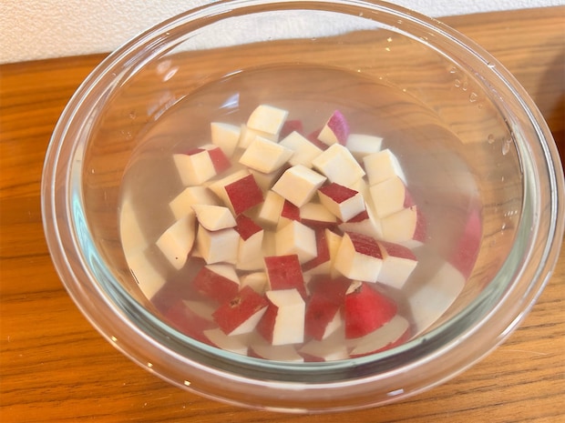 1. さつまいもは皮付きのまま、1cm角の角切りにして水にさらす。りんごは芯を取り、皮を剥かずに4等分に切って、5mm幅のいちょう切りにする。