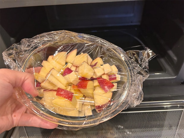 4. 耐熱ボウルに1のさつまいもとりんごを入れて、上からふんわりラップをかける。電子レンジ500Wで3分加熱する。