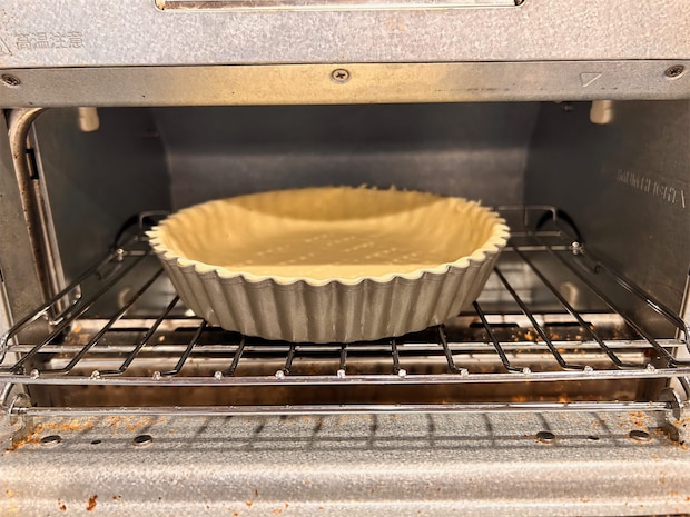 2. 解凍したパイシートを麺棒で軽く伸ばす。15cmのタルト台に敷き詰めて、側面もしっかり張り付ける。麺棒を使って余分な生地を切り落としたら、フォークで底にピケをして、トースターで15分焼く。