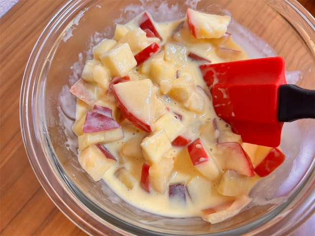 さつまいもが崩れないように、やさしく混ぜるのがポイントです。